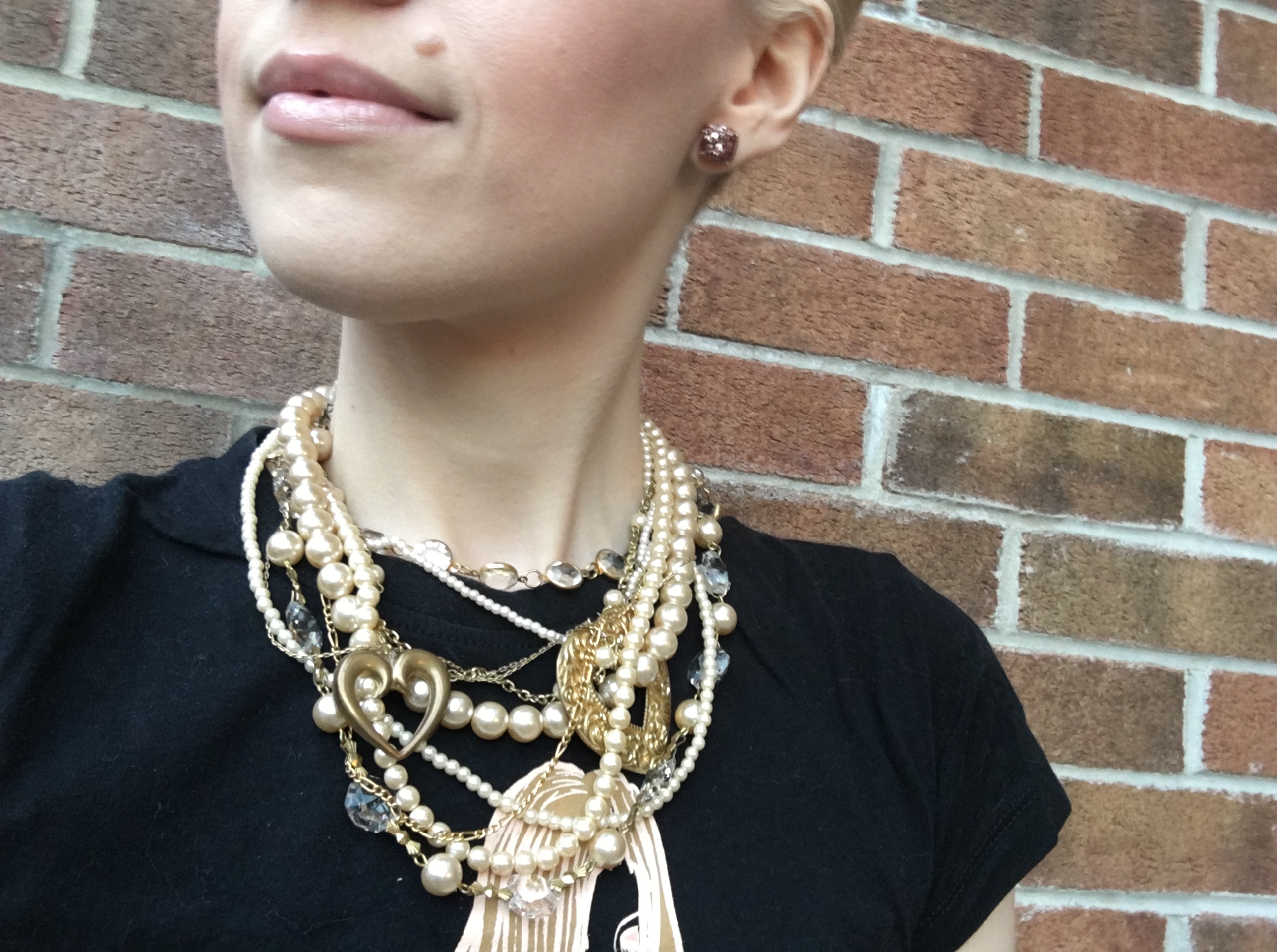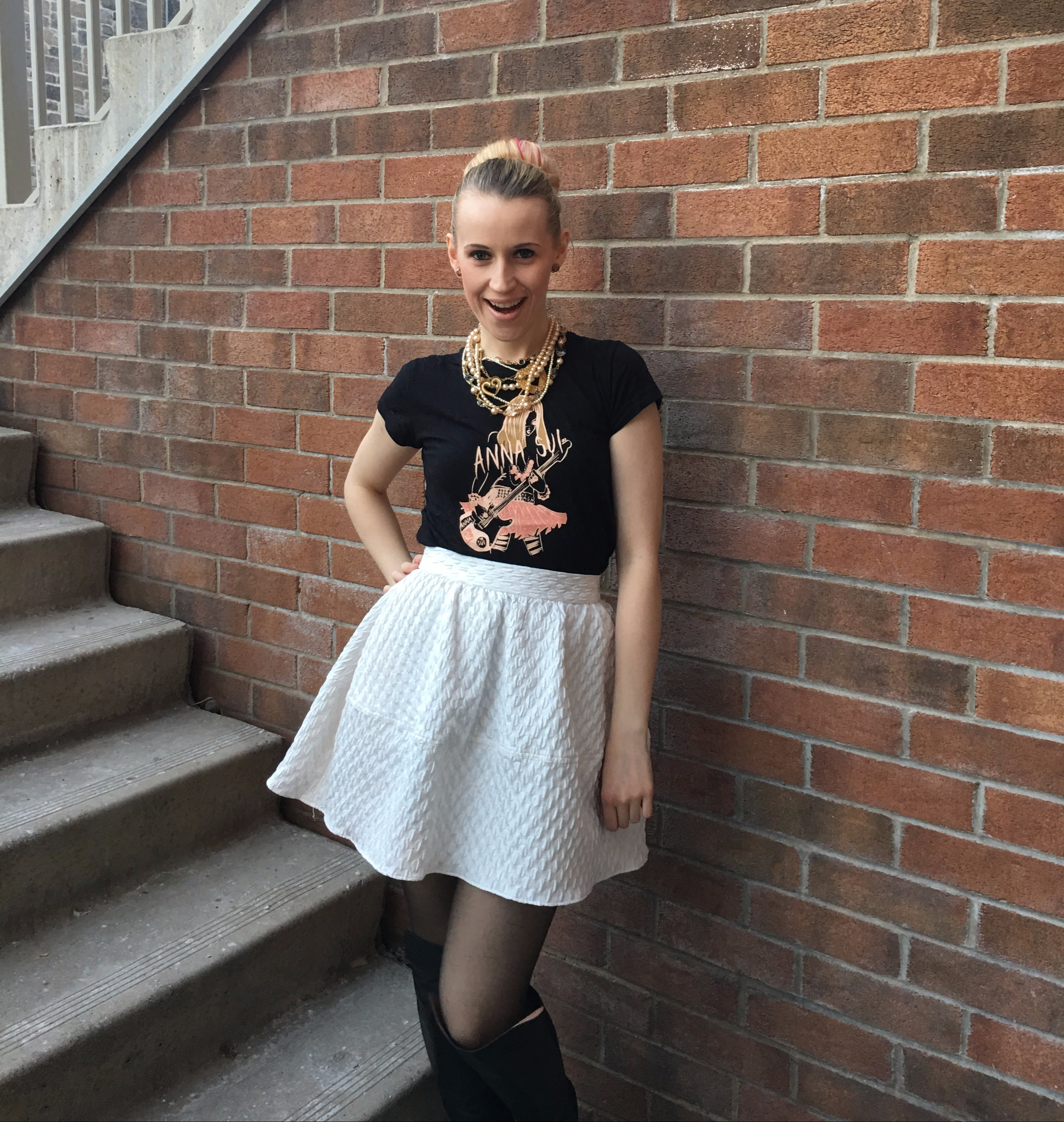 I dressed up the t-shirt with a pearl necklace I made and a pouffy skirt to make the look more girly and funky. The sock bun has a pop of neon pink extensions which brings out the pink in the shirt and the make-up is nude. I wore this outfit to a friend’s spontaneous house party.