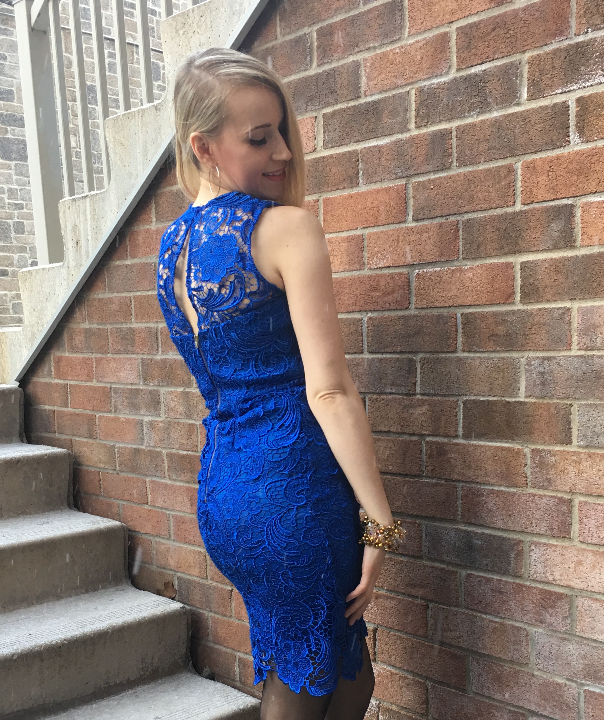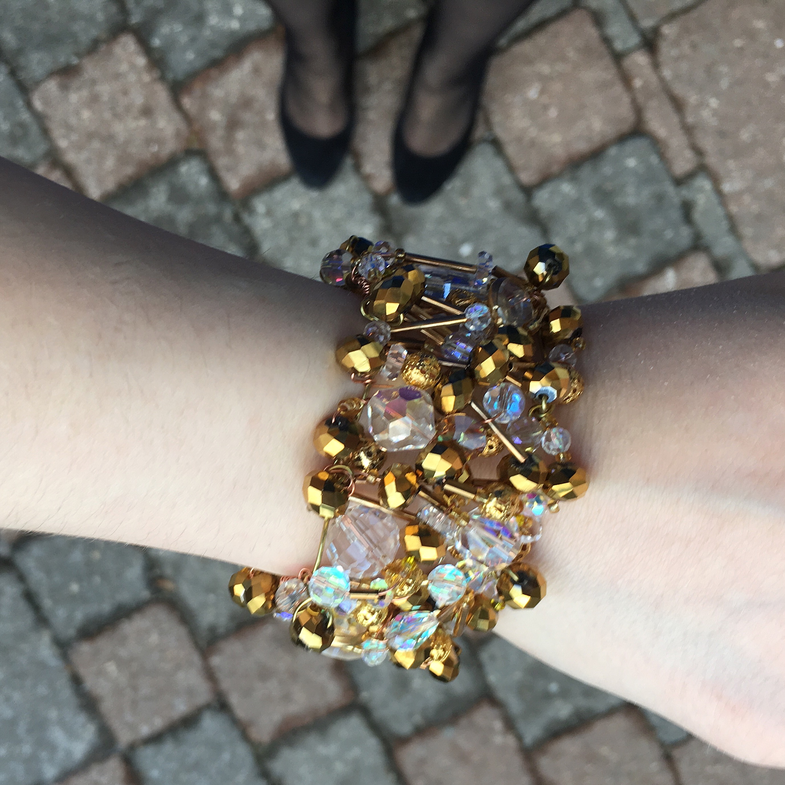 I got this dress for an amazing deal when Fashion Crimes on Queen Street West closed. It is now my go-to office party dress. It feels fancy to me; without being over the top. The peak-a-boo lace details make the dress appropriate for evening without showing too much skin. I love the gold zipper at the back; it gives the elegant lace some edge. I wore gold jewelry to bring out the gold of the zipper. The bracelet is one of my experiments made just for me.