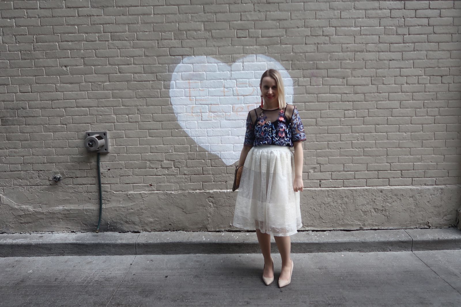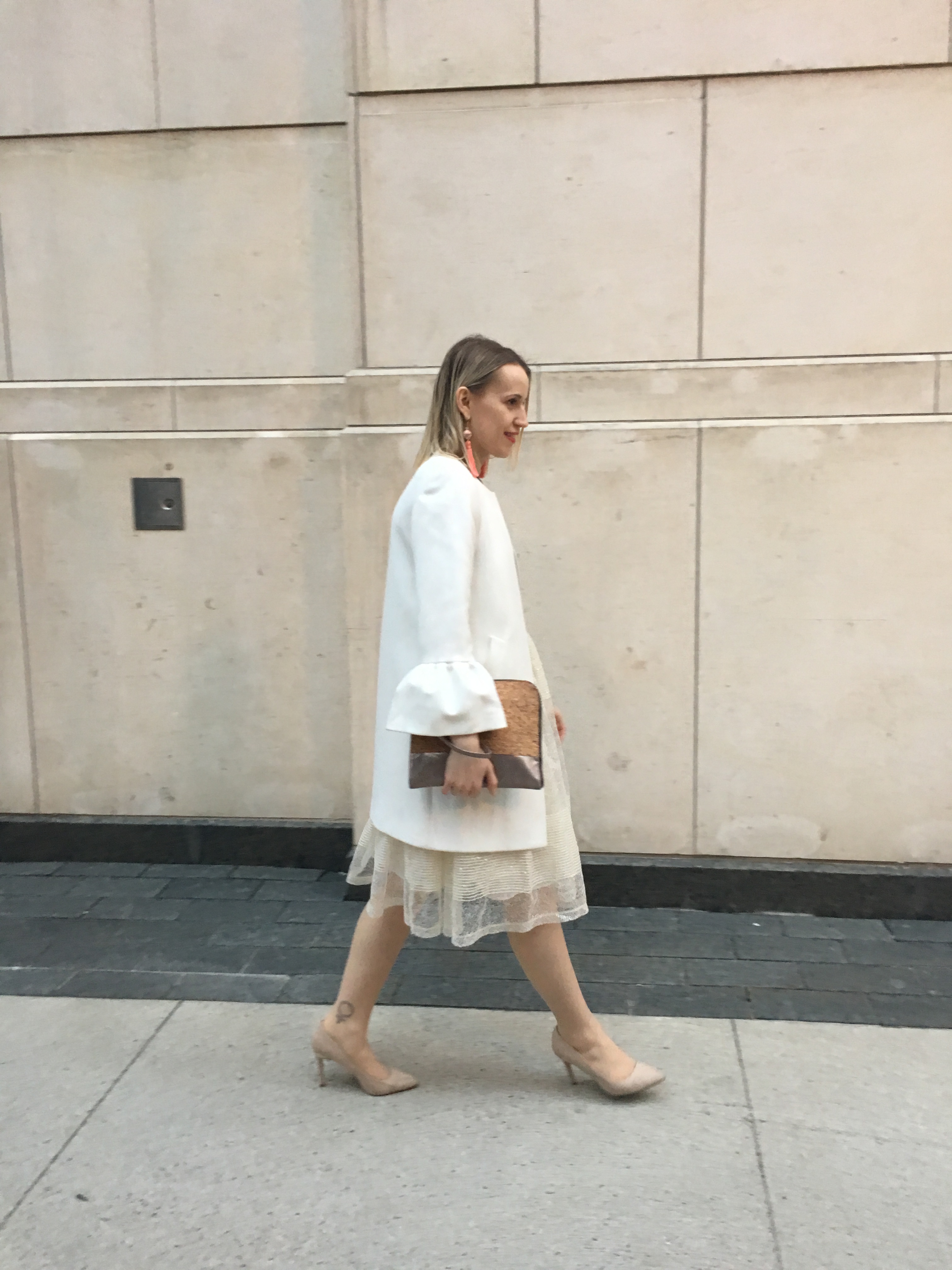 I chose this sheer shirt because it has a tiny bit of coral in it, like I said this whole outfit exists because of these earrings. The skirt is gauzy and has some shimmer, someone commented that it was like Cinderella. Generally I would wear this shirt with a tight pencil skirt since it is loose. But everything I had was black and black seemed so drab for a sunny day. So I went for the opposite of my usual and created a neutral outfit. Usually I go for colour overload, but the shirt and earrings are fun enough. The cream skirt has some shimmer in it and the coat reminds me of what a politician would wear. I paired the look with nude pumps to give the look more softness.