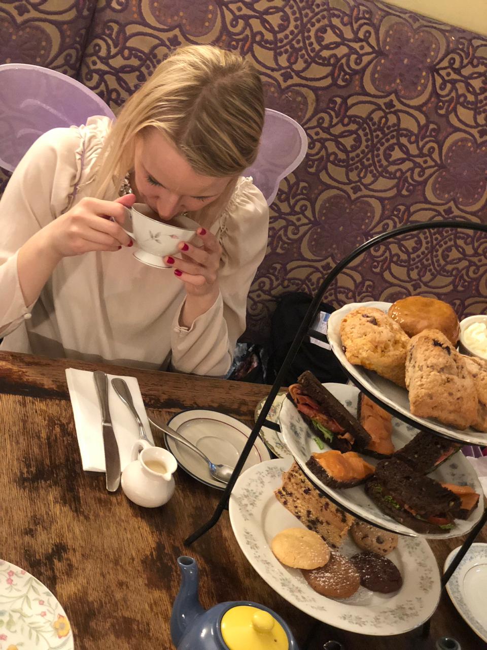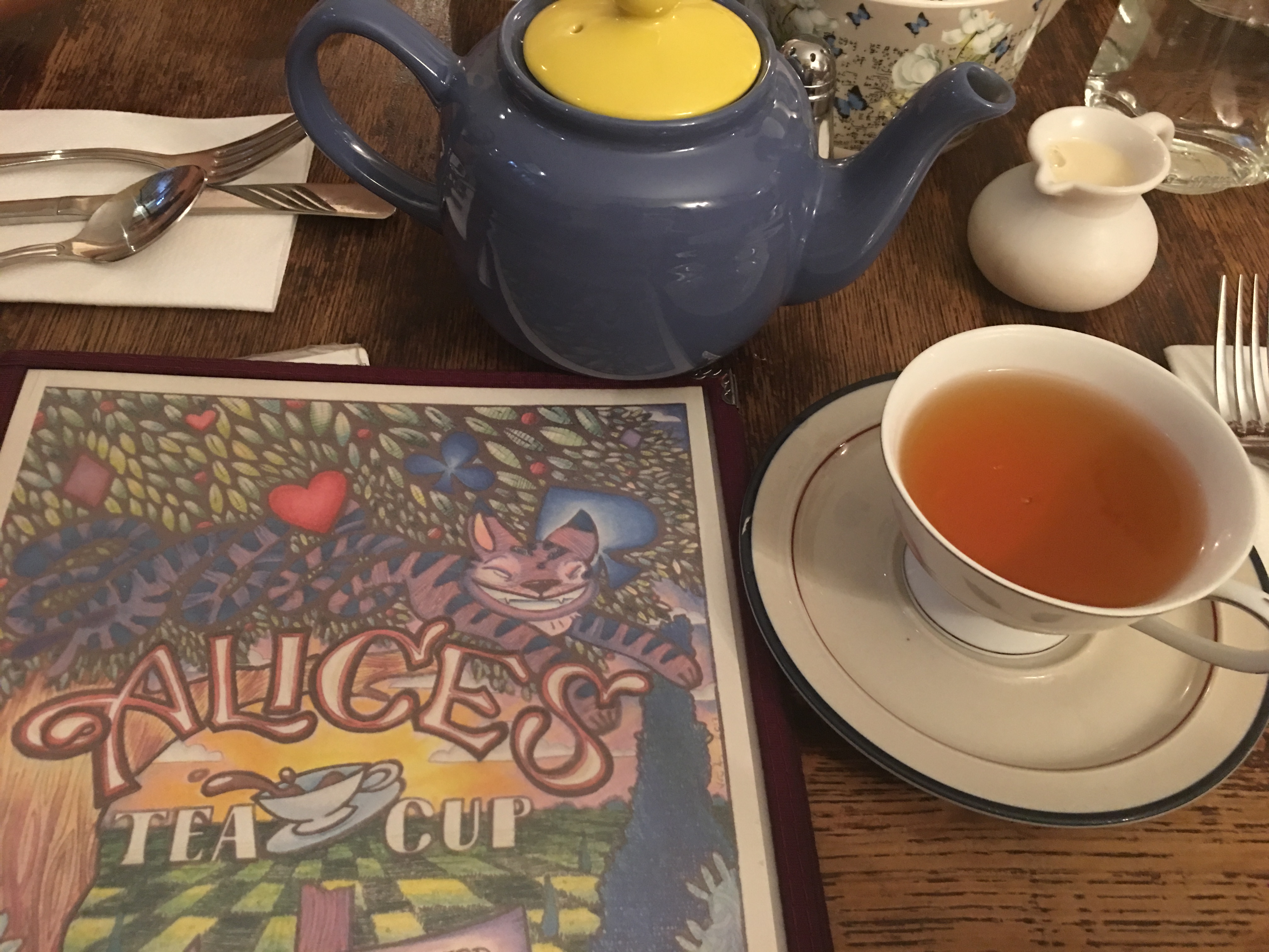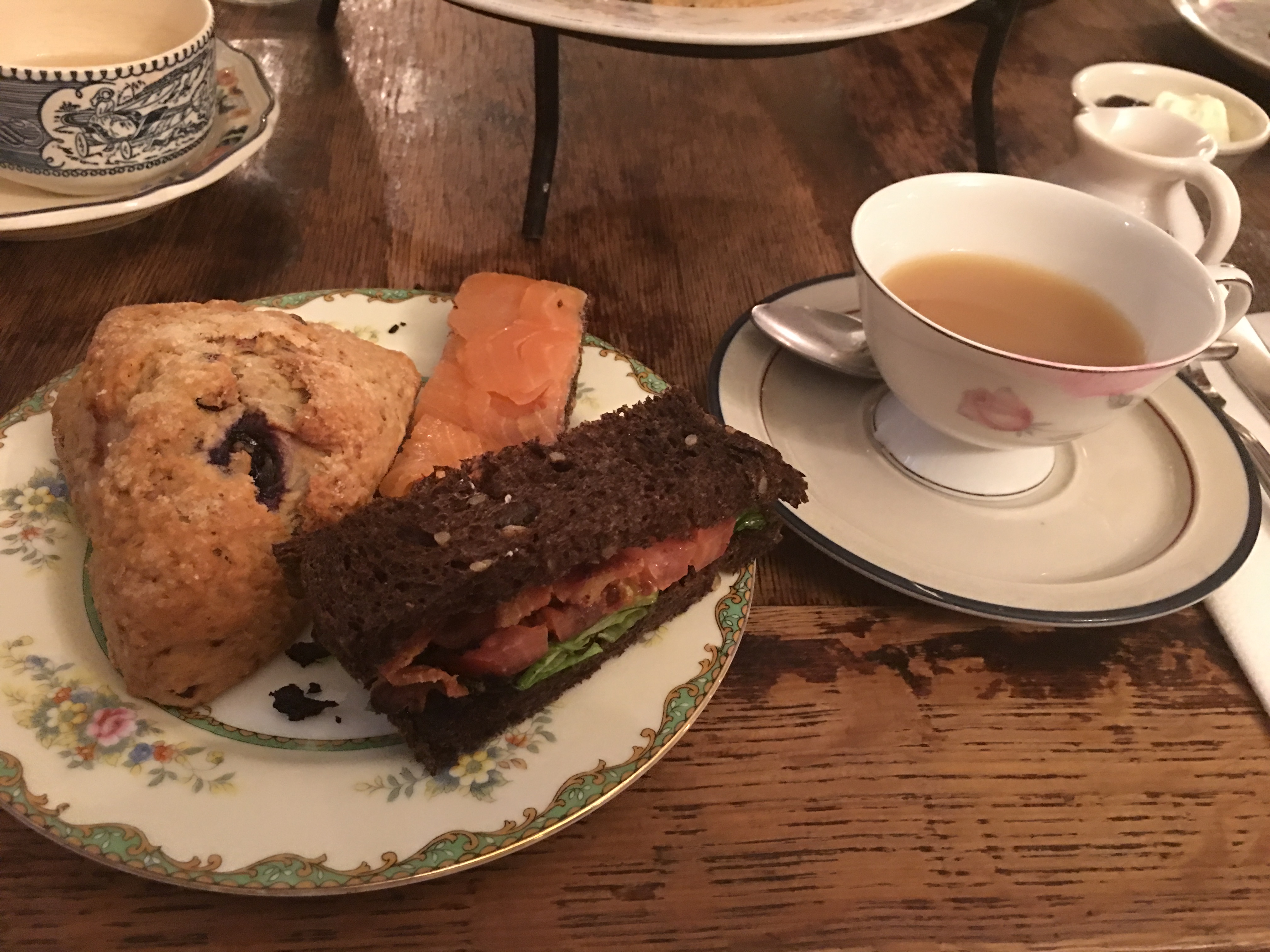 After the MET we wandered around some stores and looked for a place to eat. To my joy we passed Alice’s Teacup – which has always been on my NY to-do list. It is an Alice in Wonderland themed afternoon tea shop. If you know me, you know I live for afternoon tea. The place was nut-friendly and didn’t use nuts in their scones – such bliss. They provided the classic three-tiered afternoon tea experience: mini sandwiches (BLT and salmon), cookies and cake and of course scones and clotted cream. We had tea for three and I was thrilled to take the leftovers home.