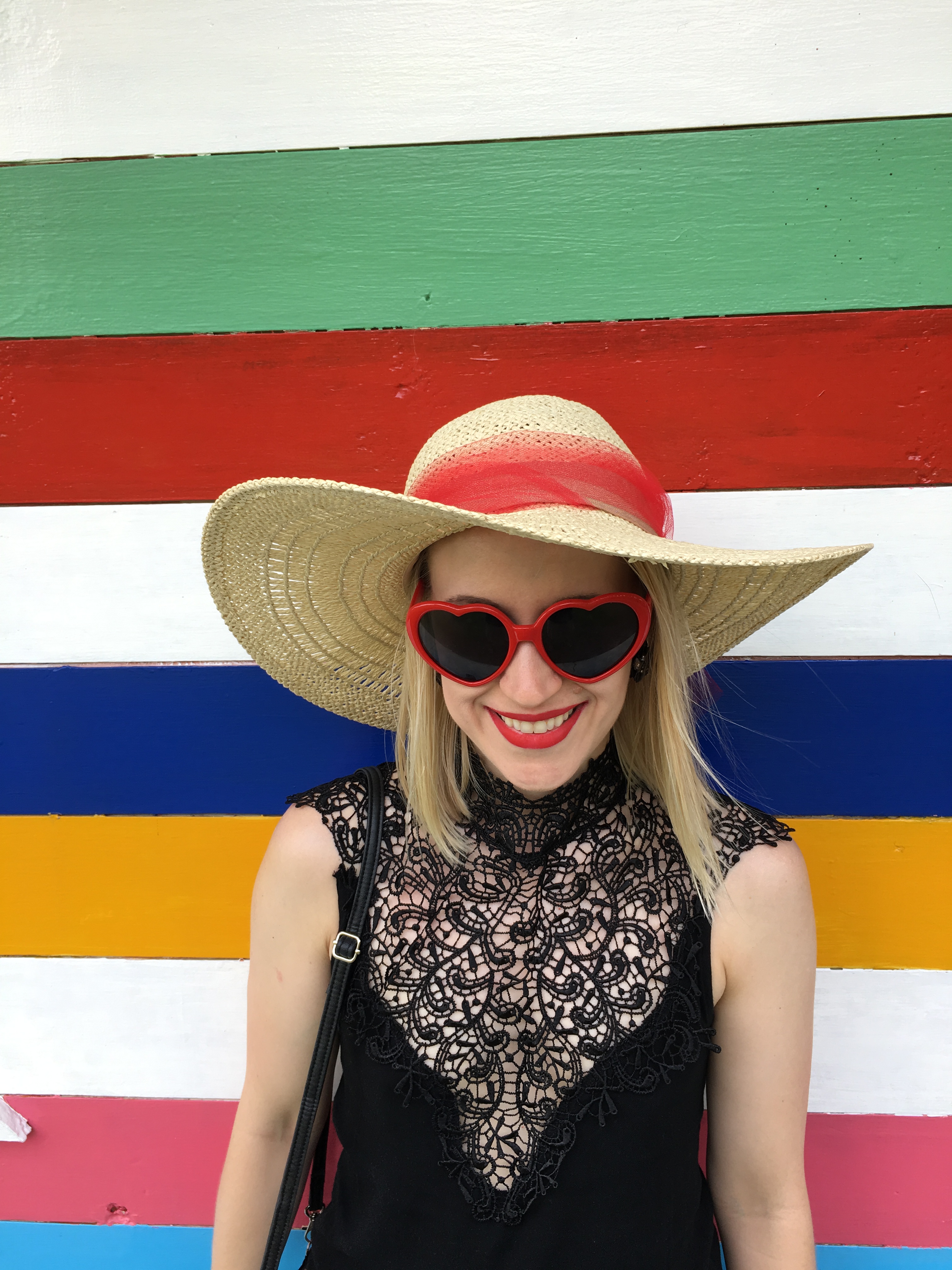 The outfit was a dress from Lulus that I wore as a shirt. It is pretty skimpy but I love the lace at the front, it feels like you’re not wearing anything at all. It was incredibly HOT out so being half-naked was a good thing. I paired it with basic jean shorts and gladiator sandals. Of course I also needed a sun hat and shades for my porcelain exterior. I added a red ribbon to the hat to match the heart-shaped glasses and red lipstick. Sadly I lost the glasses to the ocean and need to get a new pair.