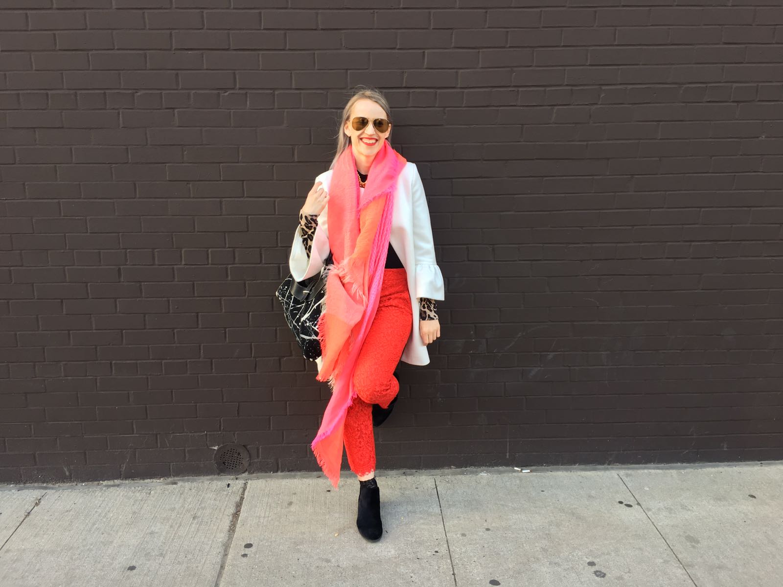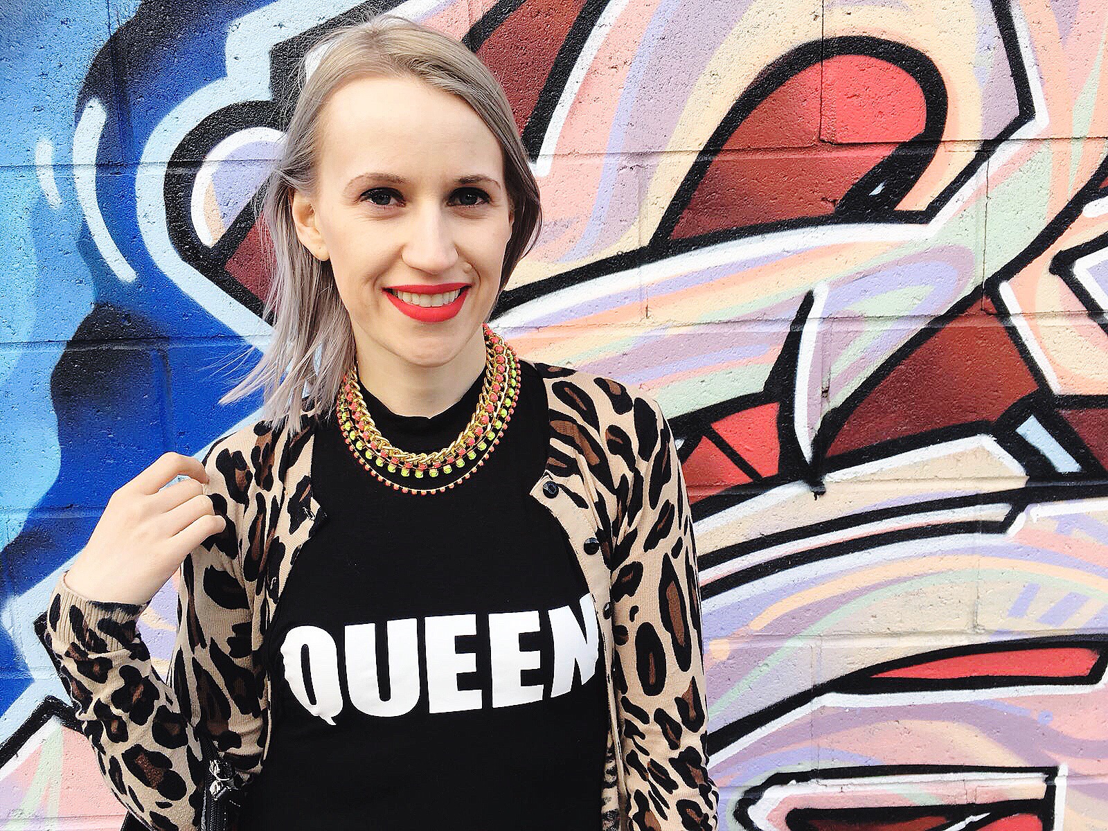 I admit it, there is a lot going on in this outfit. There is the statement shirt, neon orange and gold necklace, leopard cardigan and red lace pants – not to mention the lilac that is washing out of my hair. But I think all the craziness goes. But it may be too out there for some people, what do you think?