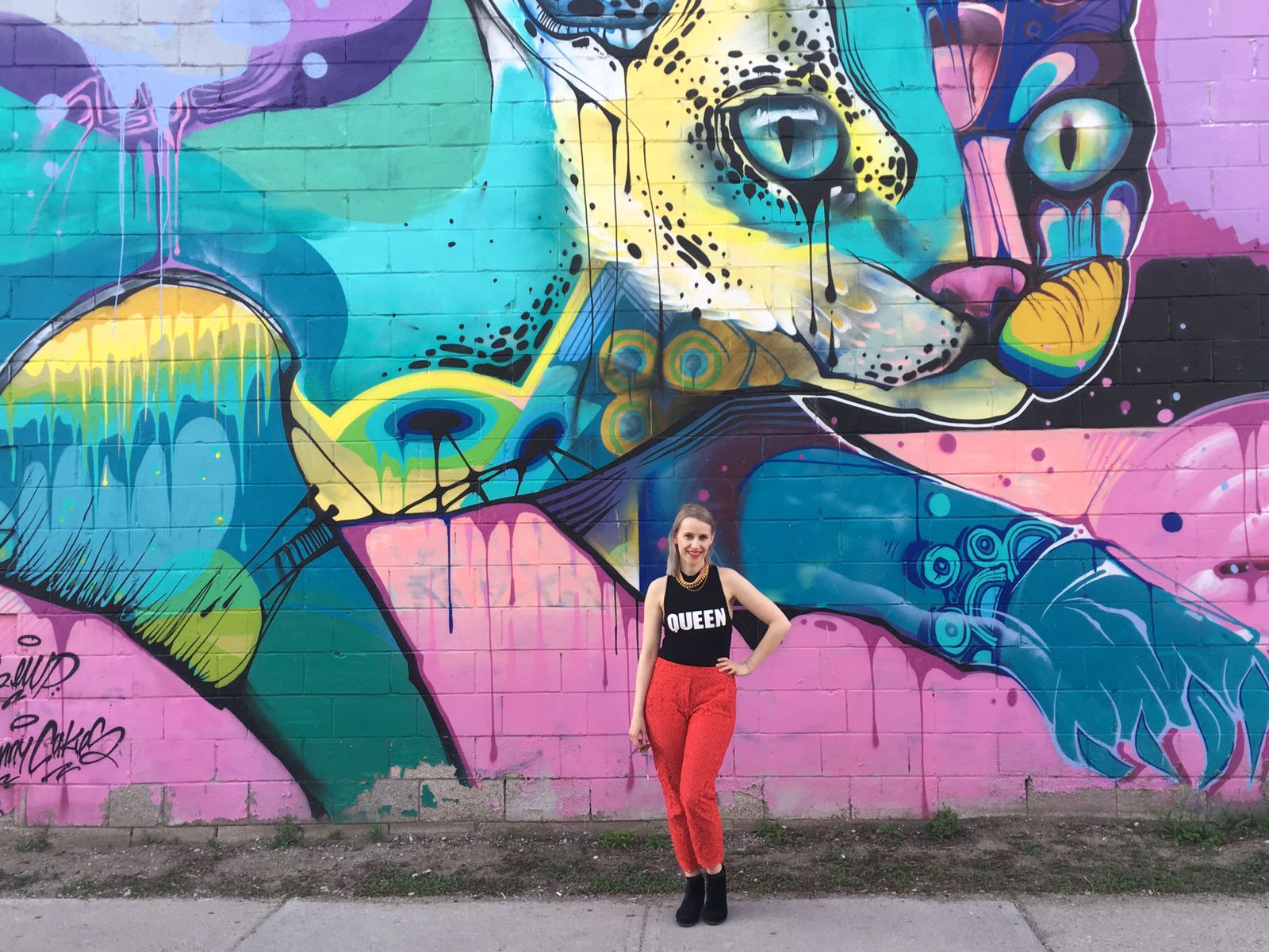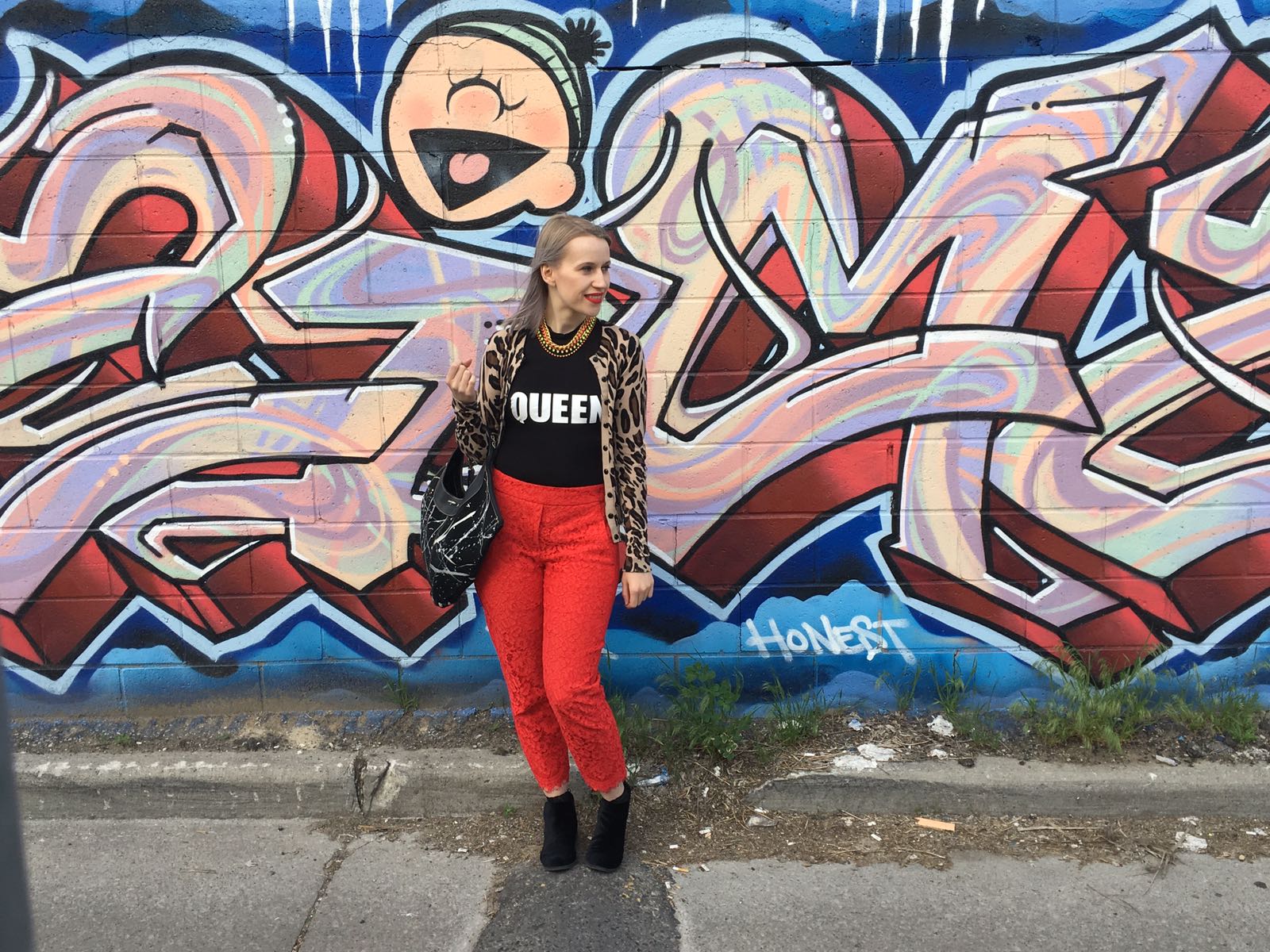 I’ve been obsessed with these red lace pants lately- they are elastic and have pockets (everything is better with pockets). They are comfy and professional so I wear them far too often. See how I wore them to afternoon tea at the AGO. I also own a pair in black too. I thought the bodysuit was hilarious and I’m envisioning wearing it with a tutu (still looking for the tutu). As mentioned, the bodysuit is pretty bare at the sides and I wanted to cover up and thought “Hey, red and leopard go!”