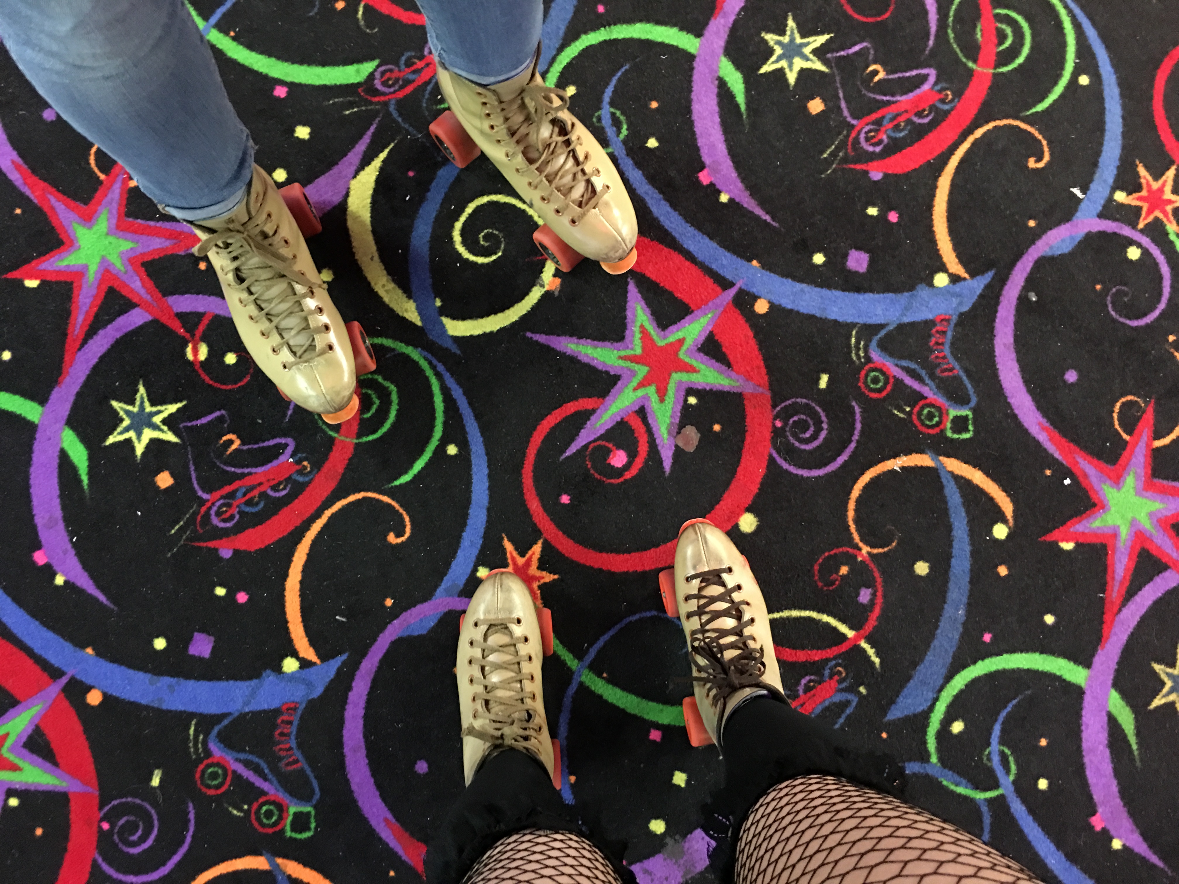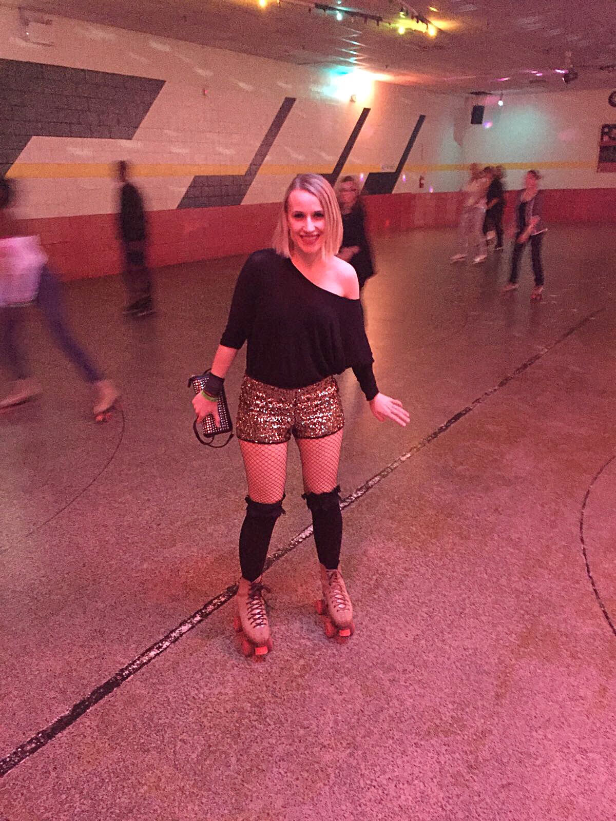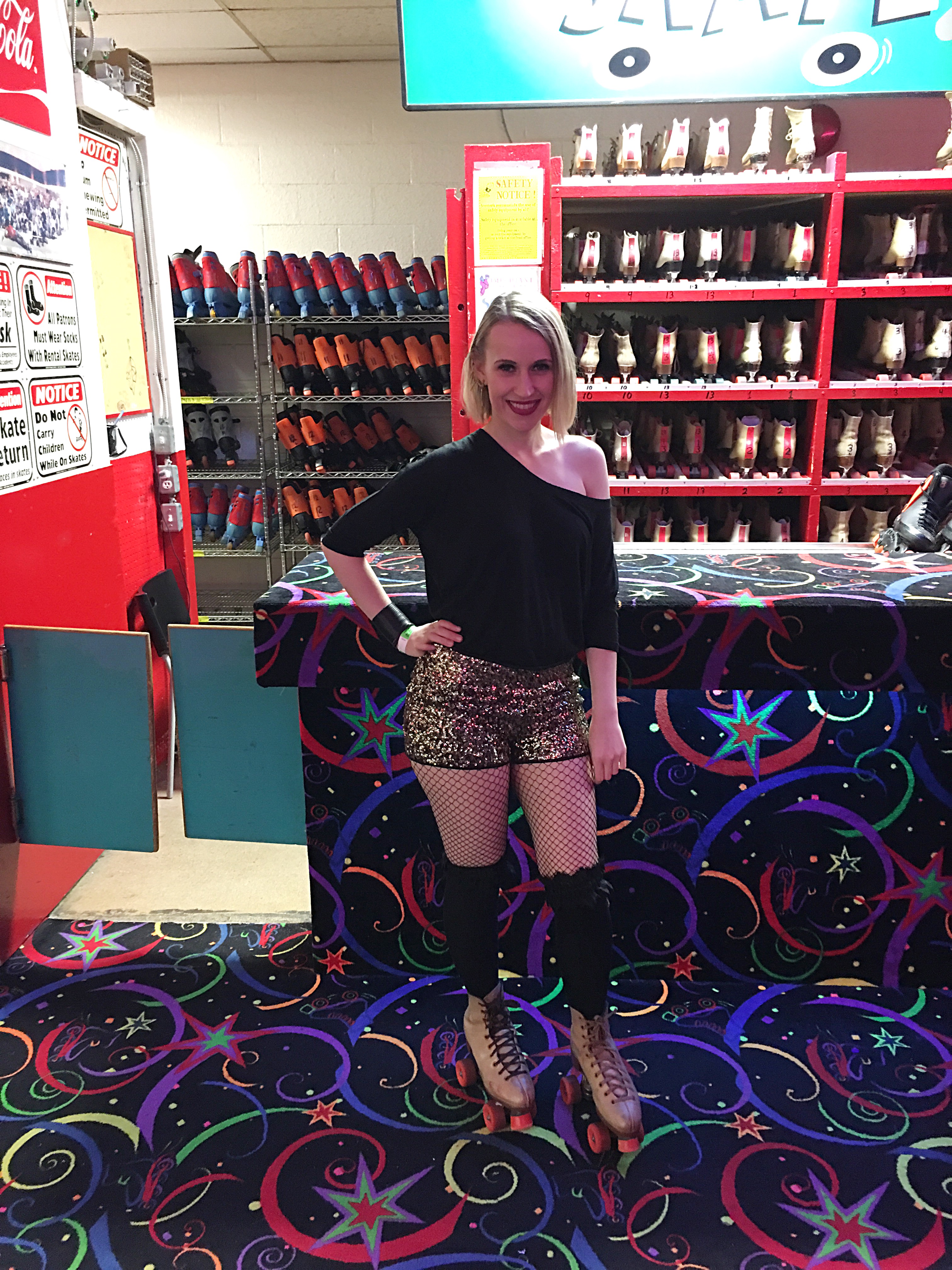 I went for a dark more gothic roller disco look. I paired the statement gold sequinned shorts with a black off the shoulder shirt, wide black fishnets and knee highs. The knee highs were thick in case I fell (it only happened once). I had never used old style skates like this before but it was a challenge My Bff pictured fell at least three times in an hour; but he made me proud by getting up every single time! Persistence!